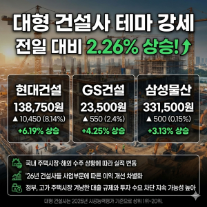 최근 국내 주식 시장에서 대형 건설사 테마가 투자자들의 높은 관심을 받으며 강세를 기록했다. 이 흐름 속에서 주요 건설사인 현대건설은 6.19%, GS건설은 4.25%의 주가 상승률을 보였다.