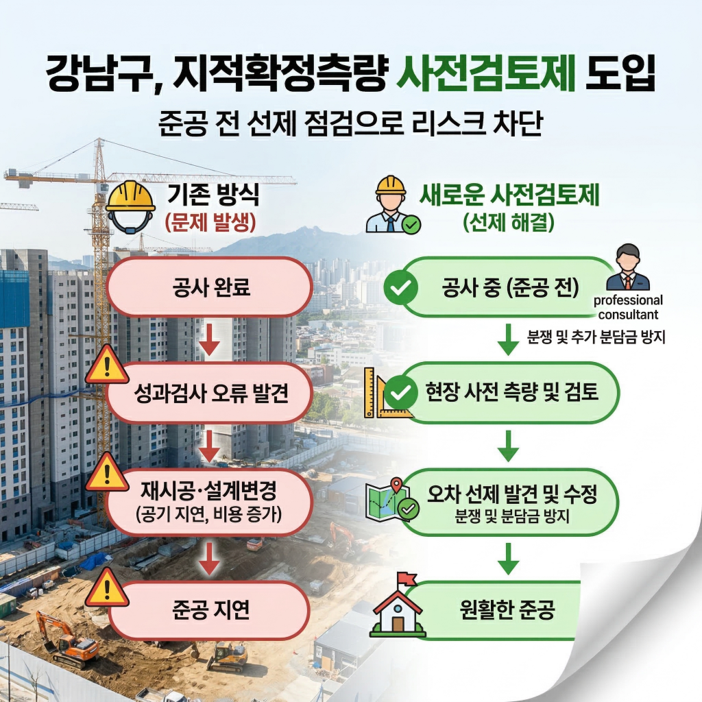 강남구가 토지개발사업 및 재건축 정비사업의 준공 단계에서 발생하는 각종 행정적·물리적 마찰을 줄이기 위해 ‘지적확정측량 사전검토제’를 본격 가동한다. 이는 사업 완료 시점에 나타나는 경계 불일치와 면적 증감 민원을 예방하고, 인허가 도면과 실제 시공 현황 사이의 오차를 준공 전 미리 파악해 행정 절차를 효율화하려는 조치다.