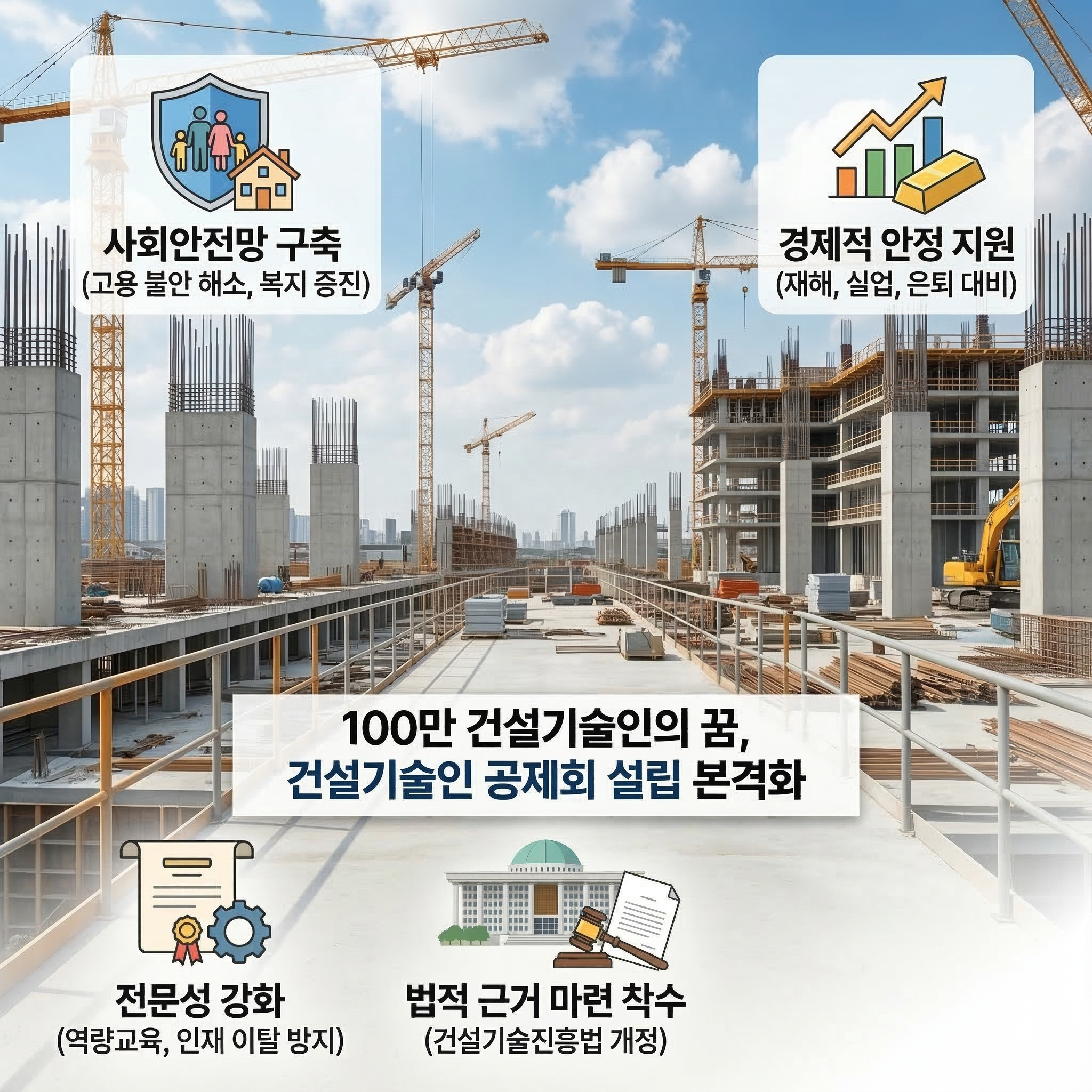 이번 입법 추진은 건설업계 특유의 고용 불안정과 ‘복지 사각지대’를 해소하는 데 목적이 있습니다. 재해, 실업, 은퇴 등 생애 주기 전반에 걸친 위험에 대응할 수 있는 ‘사회안전망’을 설계하고, 이를 위한 자금 조성 및 운용 규정을 명문화했습니다. 이를 통해 기술인들의 경제적 안정을 돕고 직업적 지속가능성을 높여 전문 인력의 이탈을 방지한다는 구상입니다.