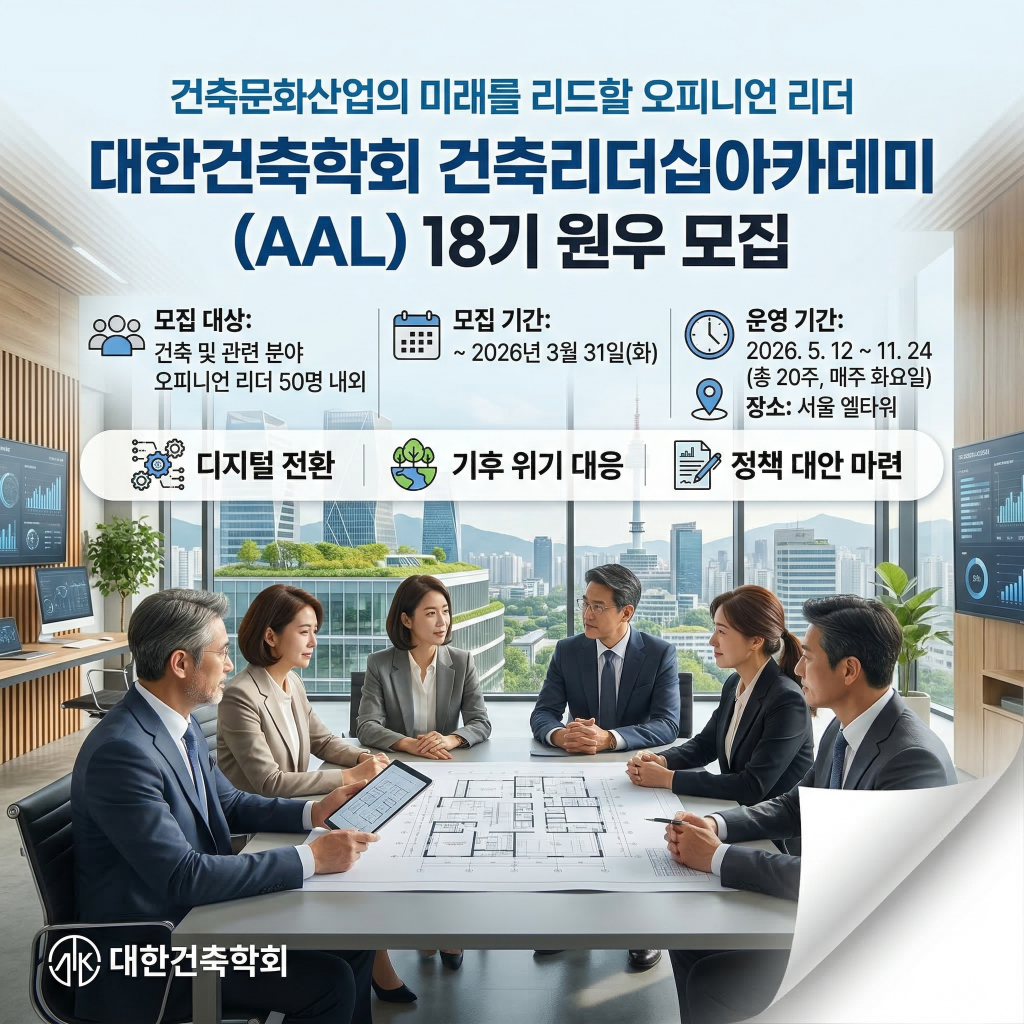 • [건축] 대한건축학회, ‘건축리더십아카데미(AAL)’ 18기 원우 모집 미래 건축 리더 양성