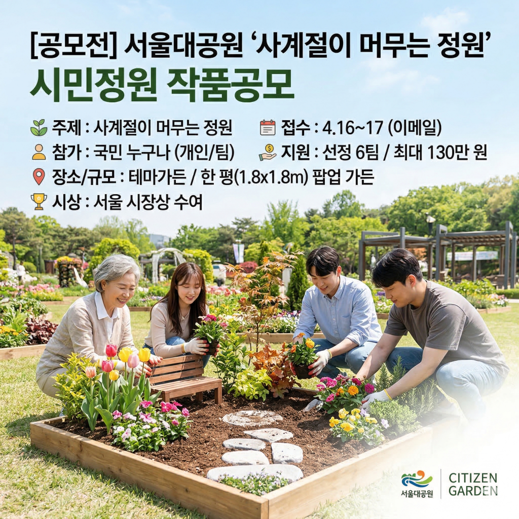 서울특별시 서울대공원이 정원문화의 대중화와 시민 참여 기회 확대를 위해 ‘2026년 제5회 서울대공원 시민정원 작품공모’를 진행한다. 이번 공모의 주제는 ‘사계절이 머무는 정원(A Garden of Lingering Seasons)’으로, 도심 속에서 계절의 변화와 여운을 온전히 느낄 수 있는 창의적인 정원 디자인을 발굴하기 위해 마련되었다.