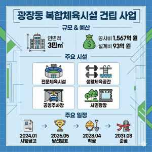 ■ ‘전문 체육’과 ‘시민 일상’의 공존 대상지는 광진구 광장동 318 일대로, 전체 부지 면적은 50,910㎡에 달한다. 이 중 약 18,840㎡에 연면적 30,000㎡ 규모의 시설이 들어설 예정이다. 이곳에는 국제 기준의 전문 체육시설뿐만 아니라 주민들의 생활체육 공간, 공연 및 행사 수용이 가능한 가변형 시설, 그리고 지역의 고질적인 주차난을 해소할 공영주차장(109대 이상)이 함께 조성된다.