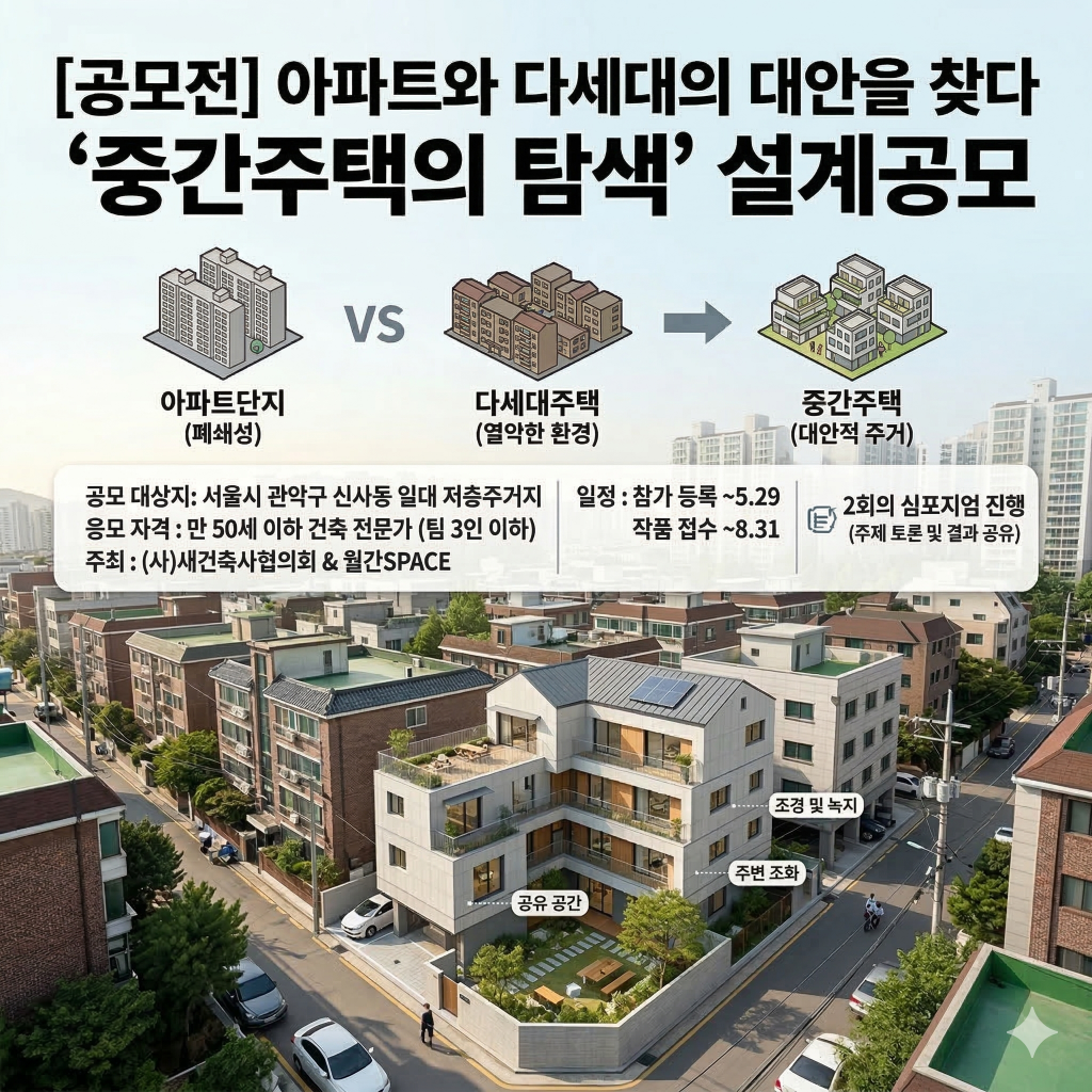 (사)새건축사협의회와 월간SPACE가 공동 주관하는 ‘동네건축설계공모 시리즈01’이 그 막을 올렸다. 이번 공모의 주제는 ‘중간주택의 탐색: 아파트단지와 다세대주택 사이’로, 대규모 아파트 단지의 폐쇄성과 소규모 다세대주택의 열악한 환경을 동시에 극복할 수 있는 새로운 주거 모델을 제안받는다. 공모 대상지는 서울시 관악구 신사동 일대의 ‘저층 주거지’로 선정되어 실질적인 도시 주거 환경 개선을 도모한다.