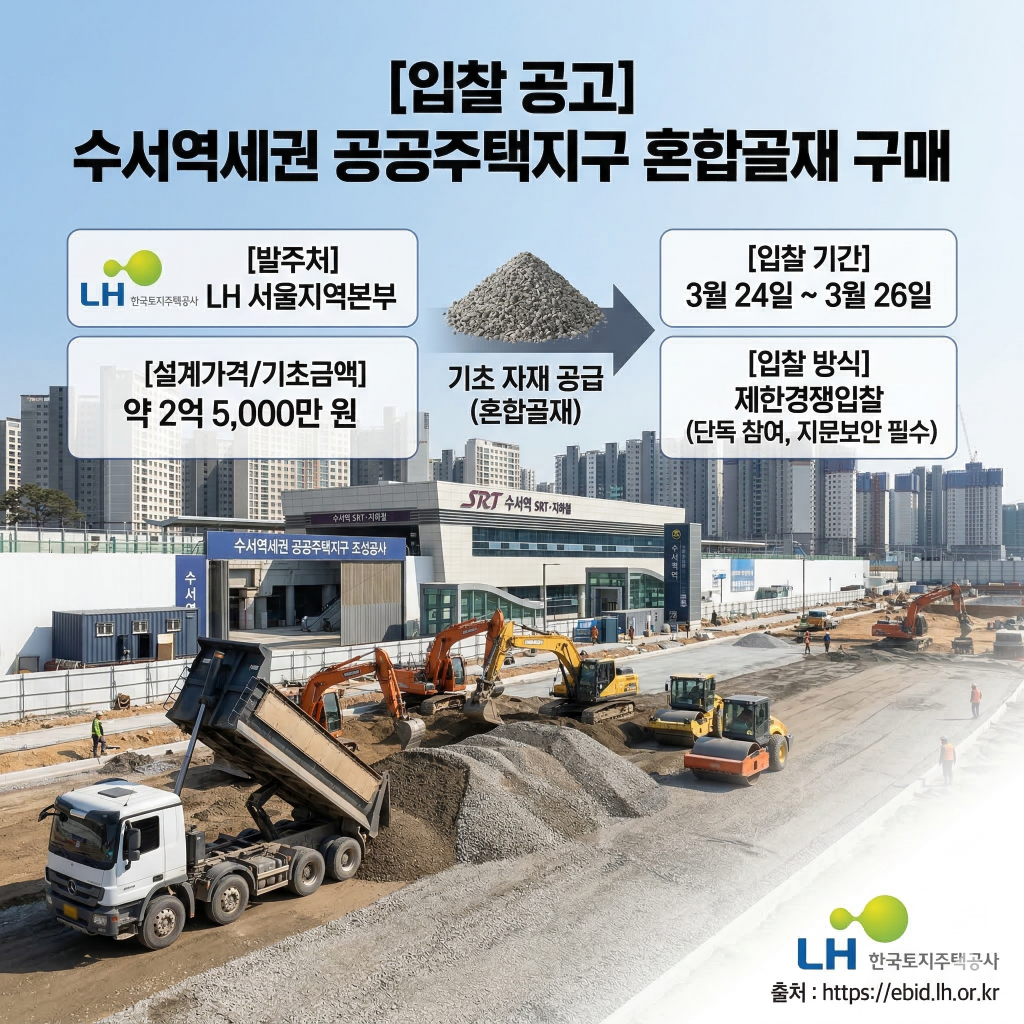 LH 서울지역본부가 수서역세권 공공주택지구 조성공사의 핵심 기초 자재인 ‘혼합골재’ 조달을 위해 입찰을 실시한다. 이번 입찰은 기초금액 약 2억 507만 원 규모로, 전자입찰을 통한 제한경쟁 방식으로 진행된다. 수서역세권은 서울 동남권의 핵심 교통 요충지인 만큼, 대규모 주거 기반 시설 구축을 위한 ‘안정적 자재 공급’이 프로젝트의 원활한 진행을 결정지을 핵심 요소로 꼽힌다.