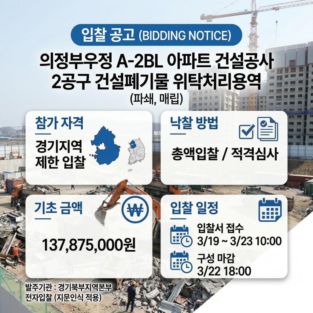 LH 경기북부지역본부가 의정부우정 A-2BL 아파트 건설공사 2공구 현장에서 발생하는 건설폐기물을 처리하기 위한 위탁 용역 입찰을 실시한다. 이번 용역은 아파트 건설 과정에서 배출되는 폐기물의 파쇄 및 매립 처리를 목적으로 하며, 기초금액은 1억 3,787만 5,000원 규모다. 계약 방식은 ‘지역제한’ 경쟁입찰로 진행되어 경기도 내 사업자를 대상으로 하며, 총액 입찰 및 ‘적격심사’ 낙찰자 선정 방식이 적용된다.