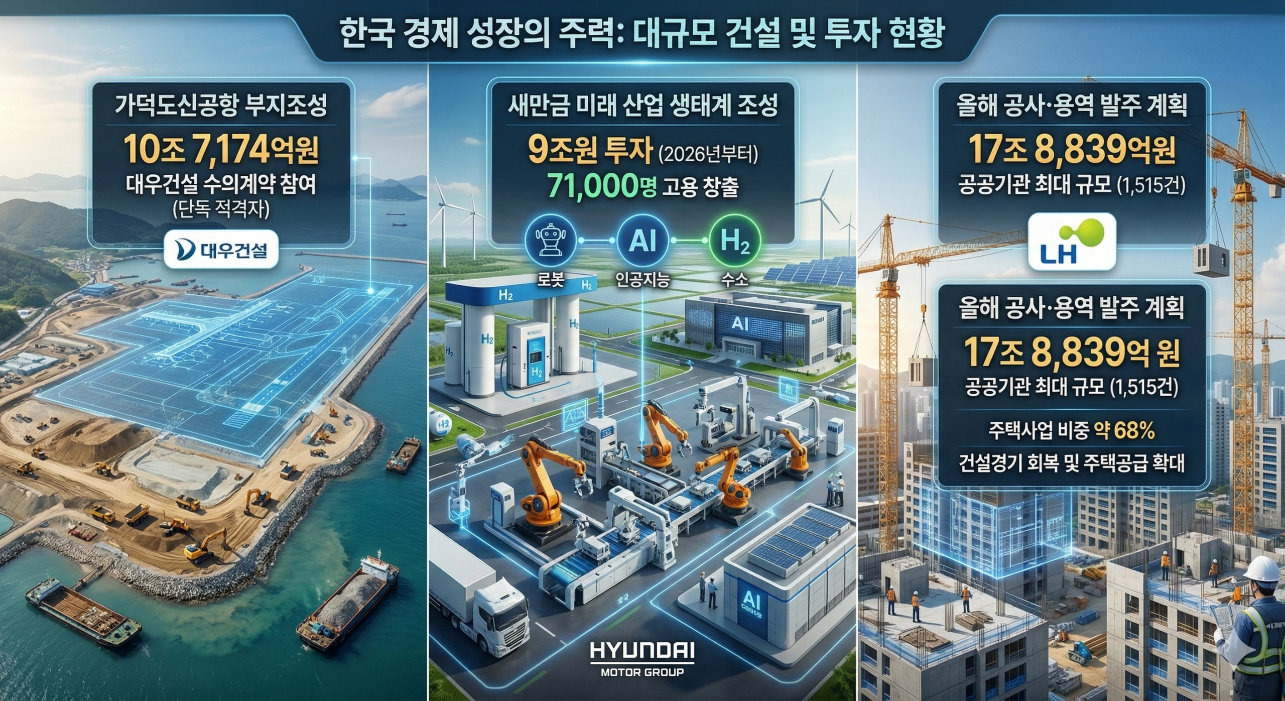 현대차그룹이 전북 새만금에 로봇, 인공지능(AI), 수소 산업 생태계 조성을 위해 2026년부터 약 9조원을 투자하고 71,000명의 고용을 창출한다. 국토교통부와 새만금개발청은 관련 인허가 절차를 적극적으로 지원할 계획이다.